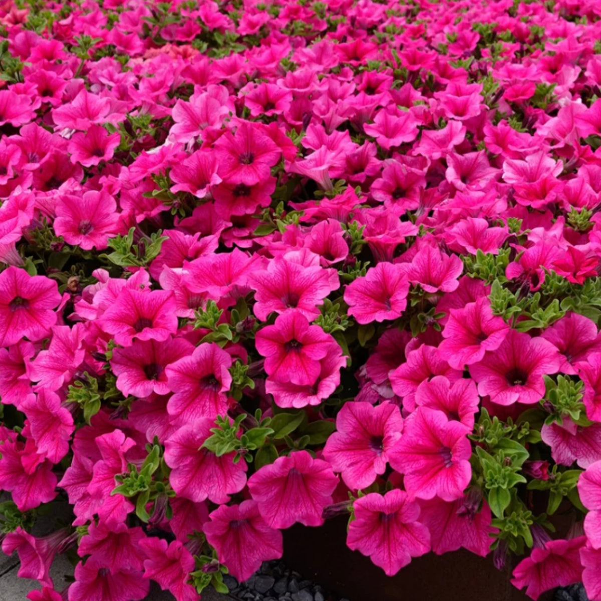 • Petunia Surfinia ‘Hot Pink’ produces trailing stems of soft textured foliage and bright pink bold coloured trumpet shaped blooms. They provide a cascade of colour during Summer and Autumn and are ideal for mixed containers or planters, window boxes and hanging baskets.