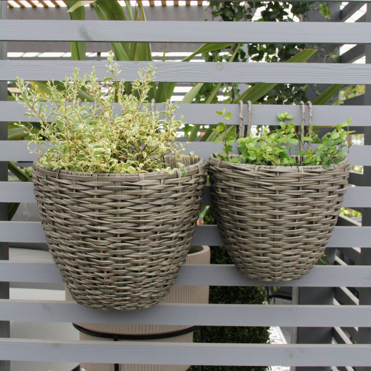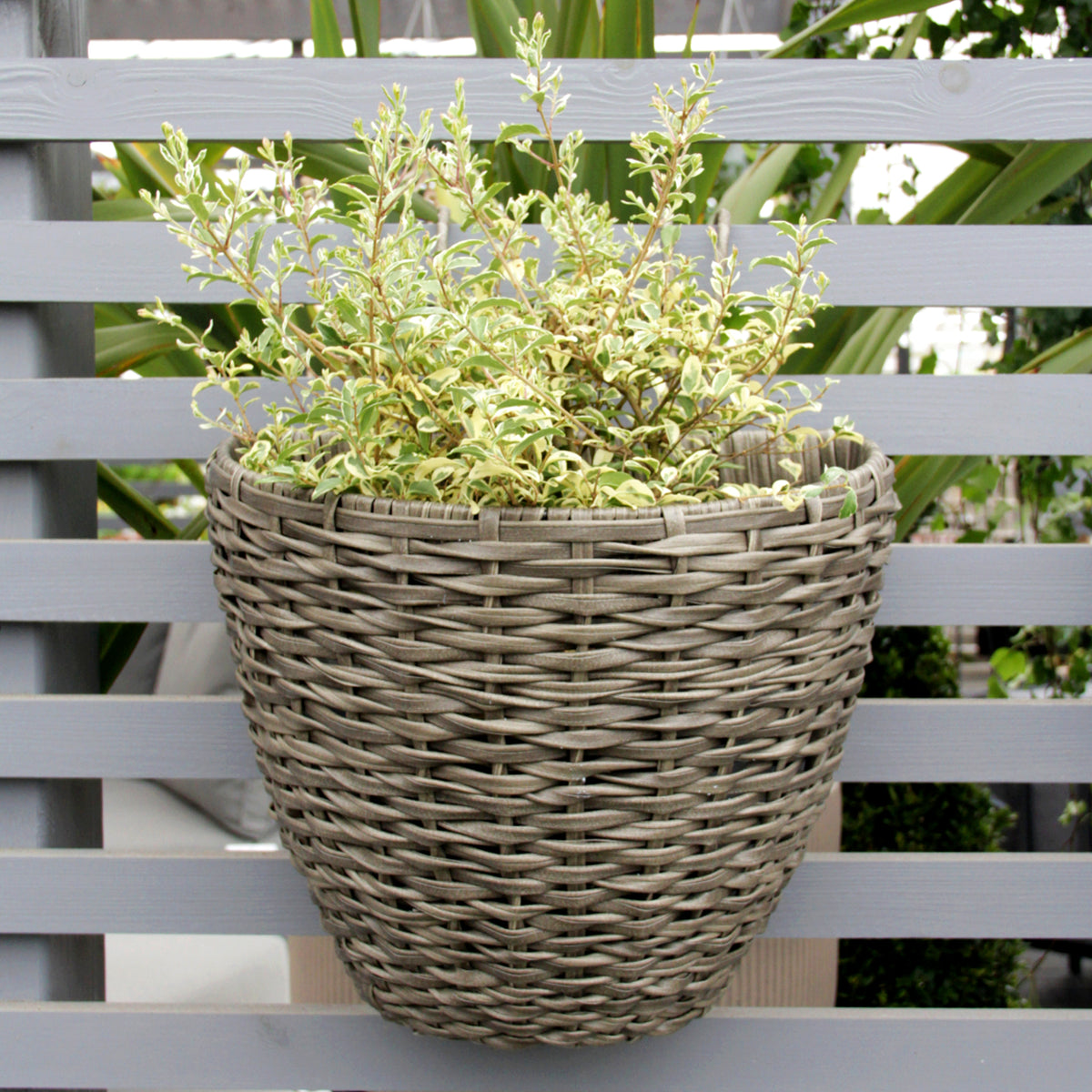 These rattan hanging planters in anthracite dark grey are ready for planting up. They have a modern, contemporary look that will complement any garden design. Once planted up, they can easily be positioned over the top of a fence or through the open spaces in slatted fencing panels. Don’t worry, these hanging planters are not limited to just fences, they can also be displayed over metal fencing or balconies.