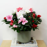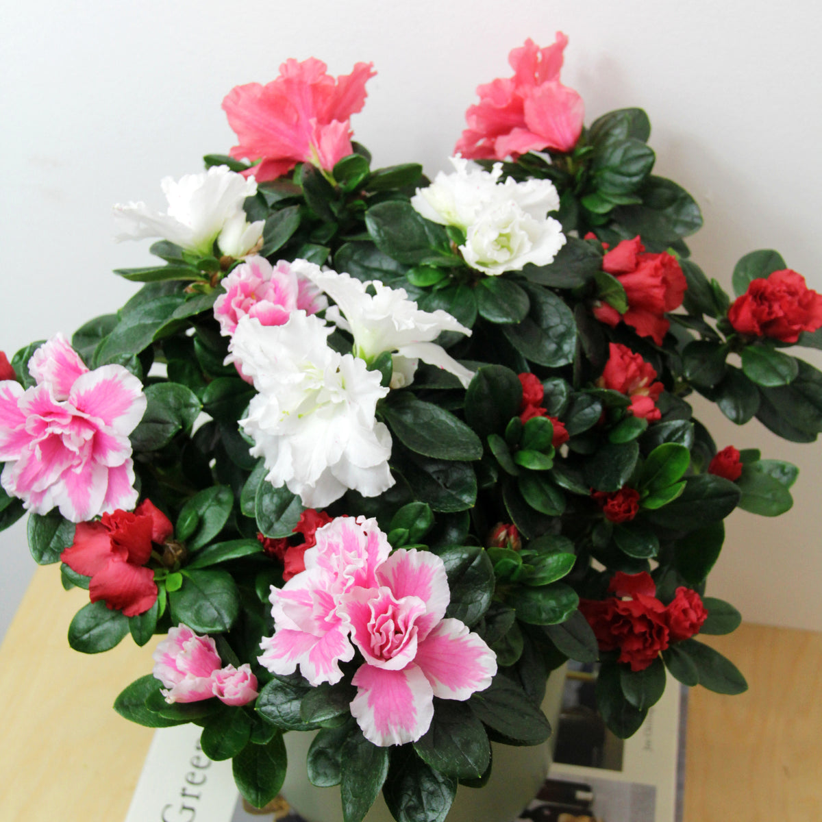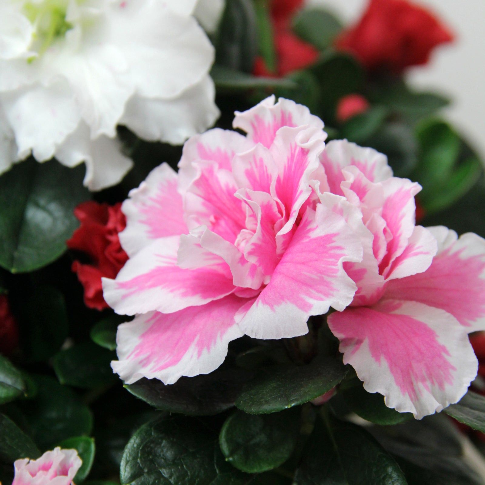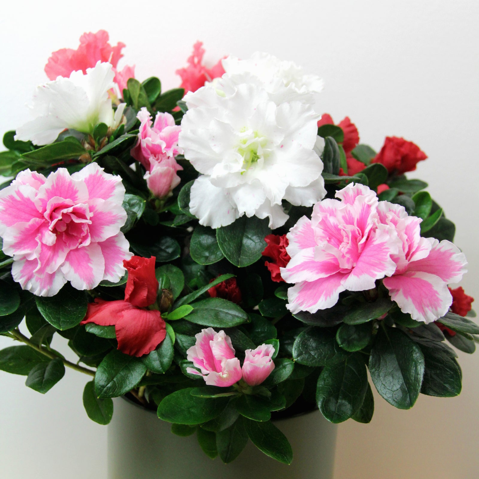 • Our Carnaval quattro potted indoor Azalea, is a flowering shrub with leathery green leaves, grown specifically for indoor conditions. This real houseplant features ruffled flower heads in white, pink, red and pink with splashes of white, grown in small clusters of two to five heads opening to 4-5cm across. Once open the blooms can last for several weeks.