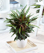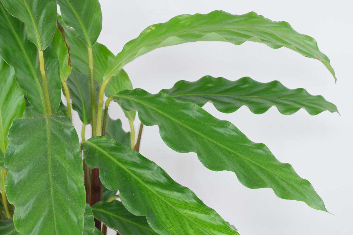 The Calathea rufibarba Elegergras, features slender, pointed leaves with an undulating edge in deep green with a reddish-purple underside. The underside of leaves have a fluffy velvet-like texture, hence why it is commonly known as the Velvet Calathea or Fuzzy Feathers plant.