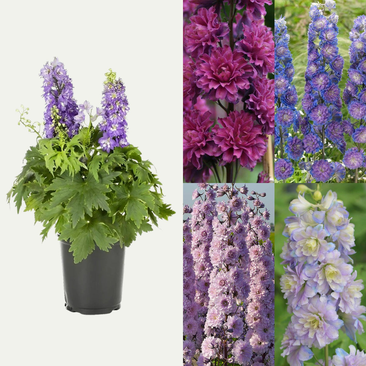 • Highlander Delphiniums are herbaceous perennials that produce lovely double flowers in shades of blue, purple, dusky pink, red and white.