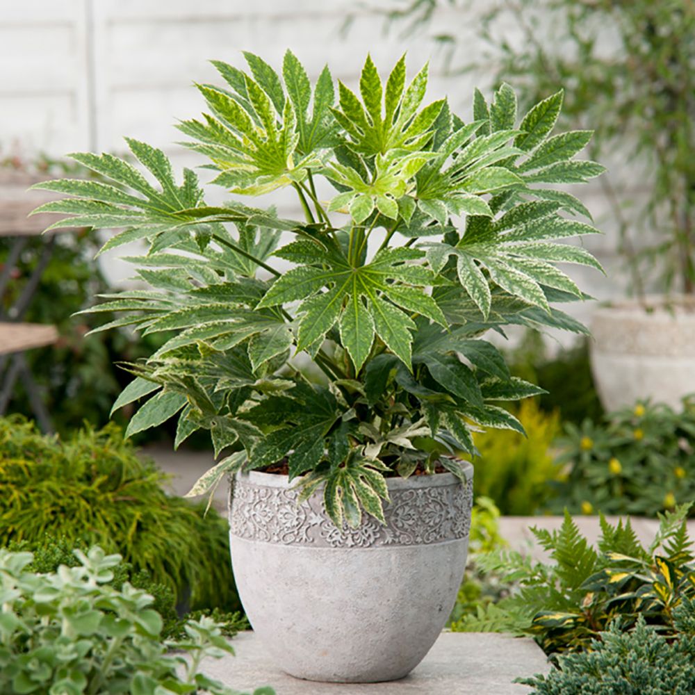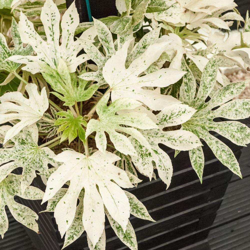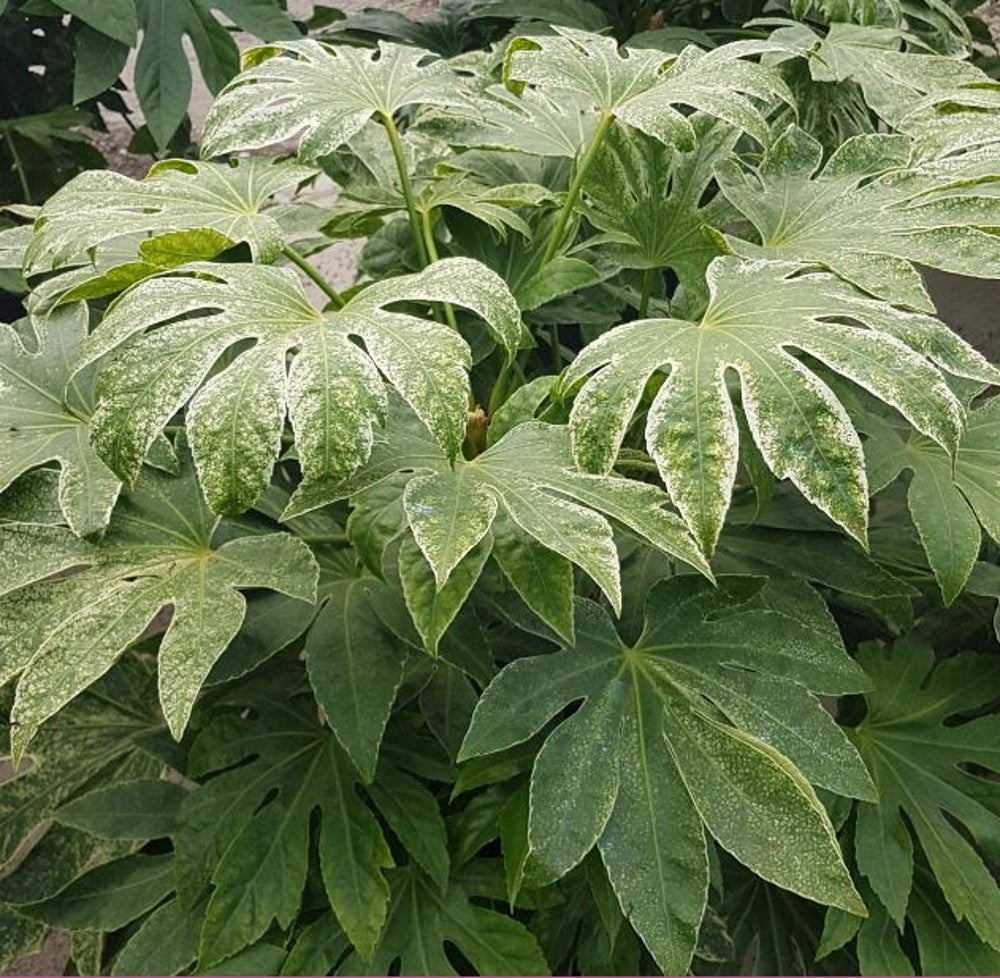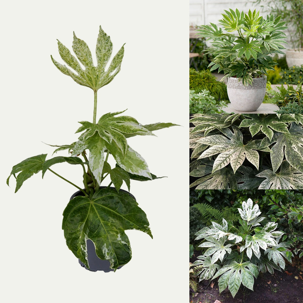 - This exciting Fatsia japonica is a bushy evergreen shrub variety with palmately lobed leaves, dappled with white, making it look as though it is covered in a 'spiders web'.