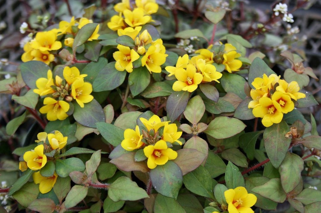 - The Lysimachia 'Outback Sunset' has striking green and gold variegated foliage with clusters of bright yellow flowers.