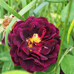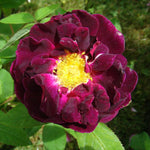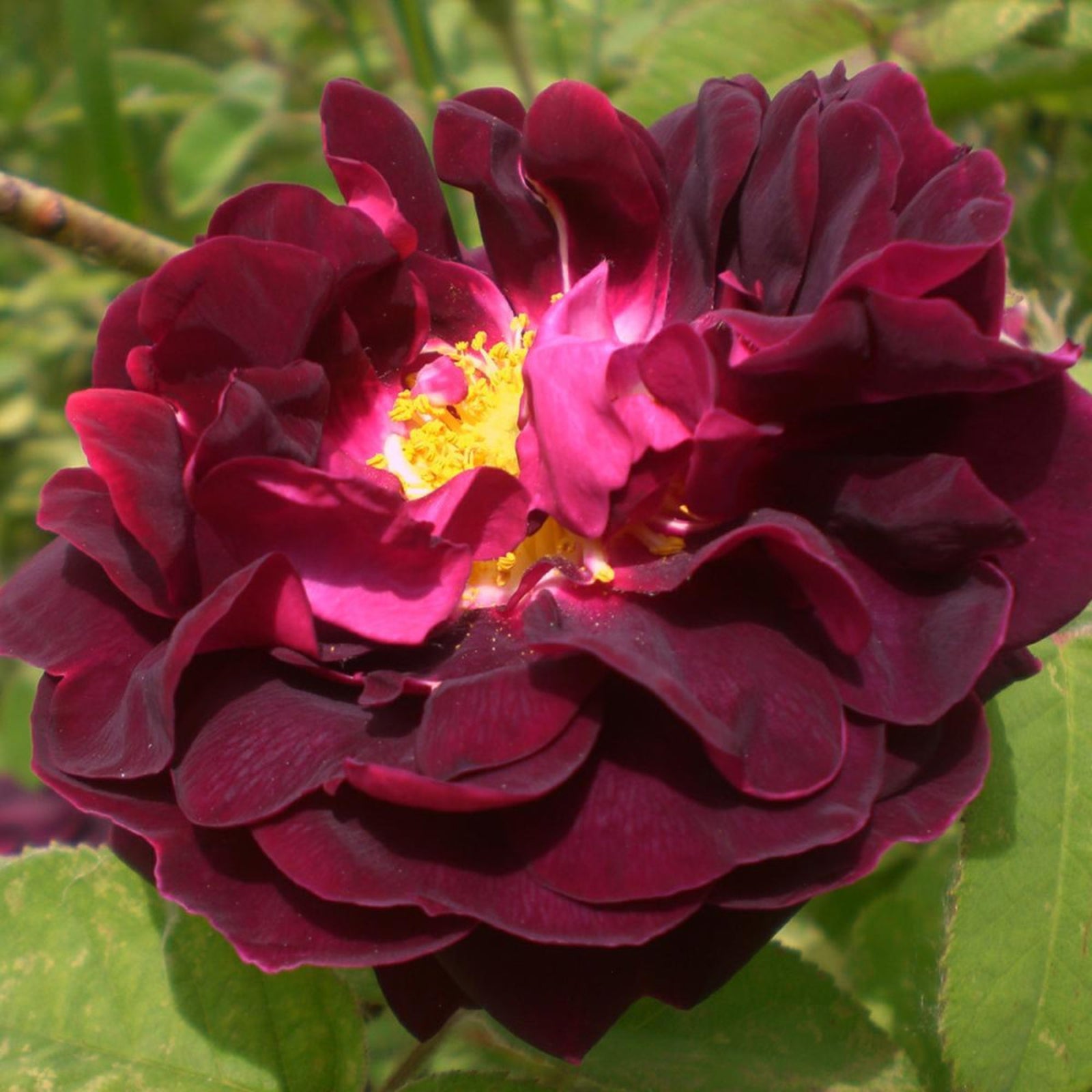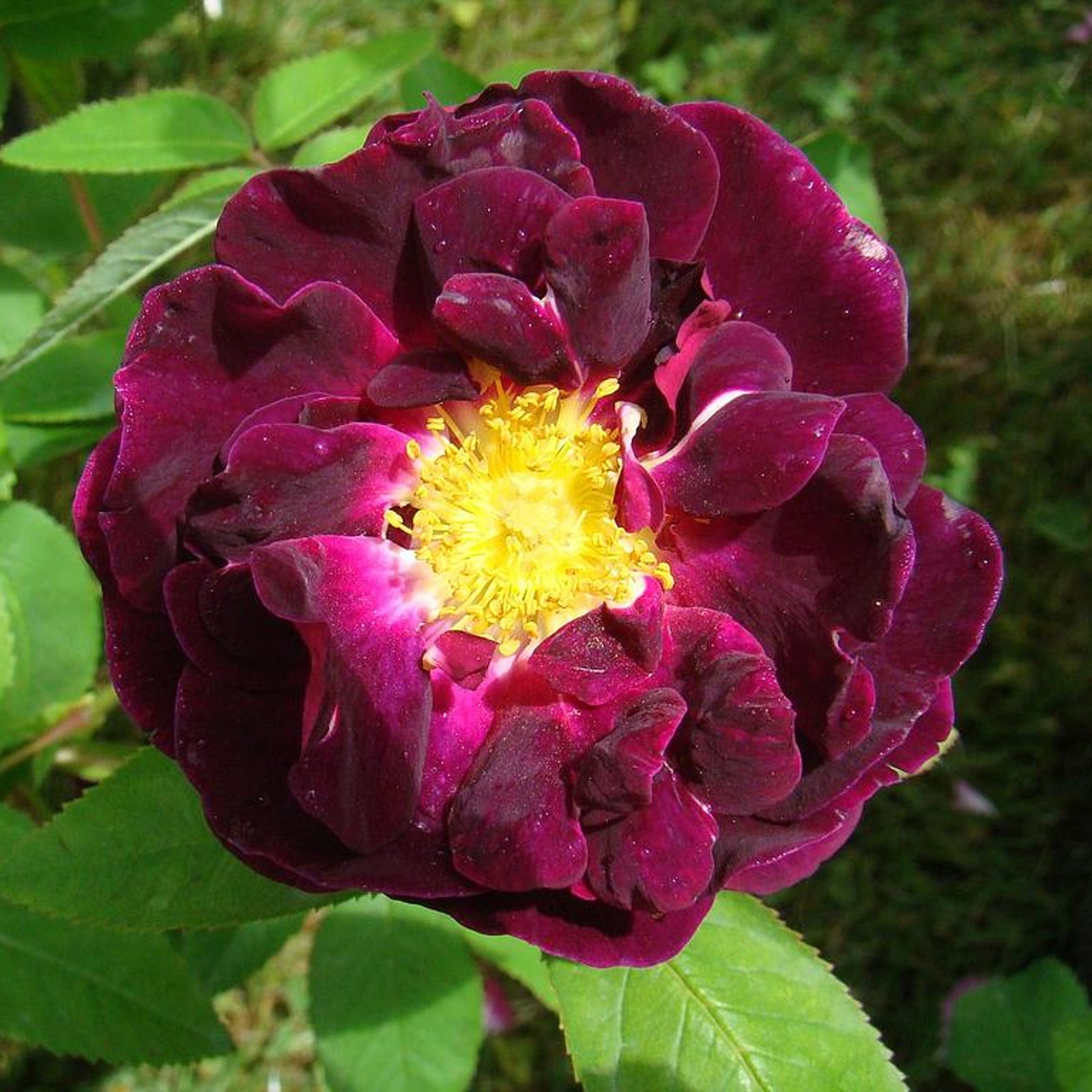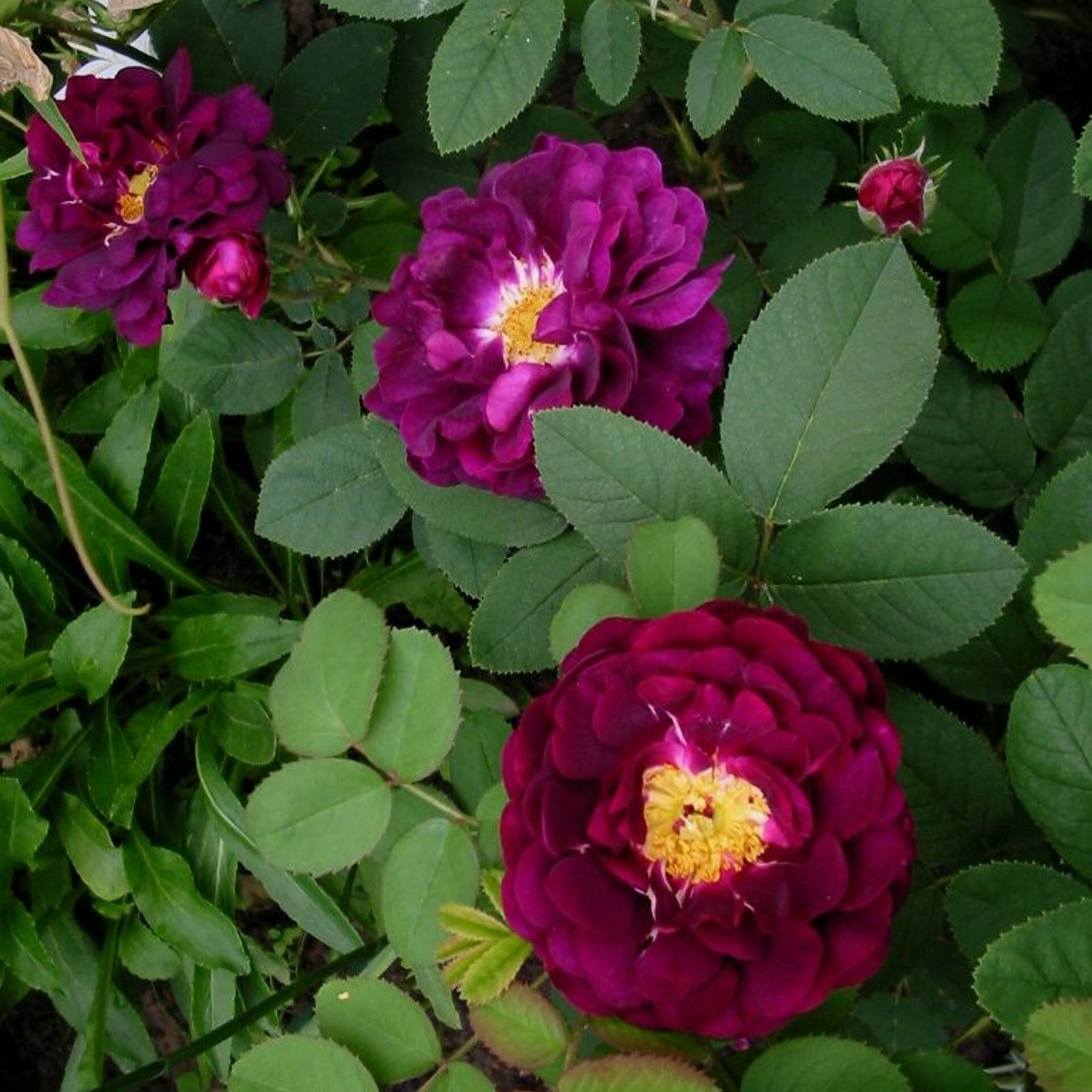 - This rose bush has a bushy upright habit with large glossy dark green leaves. The petals have a velvet like texture of deep crimson-purple and surround a coronet of prominent golden yellow stamens when fully open.
